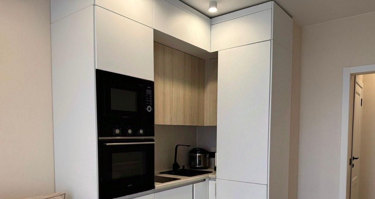 В квартире есть всё необходимое для комфортного проживания. В кухне и комнате установлена современная мебель. Техника включает холодильник, телевизор и стиральную машину. Санузел совмещенный, оборудован ванной. Высота потолков составляет 2,7 метра, что добавляет ощущение простора.