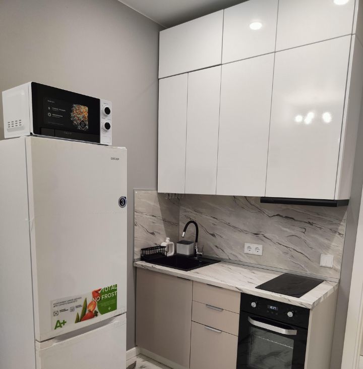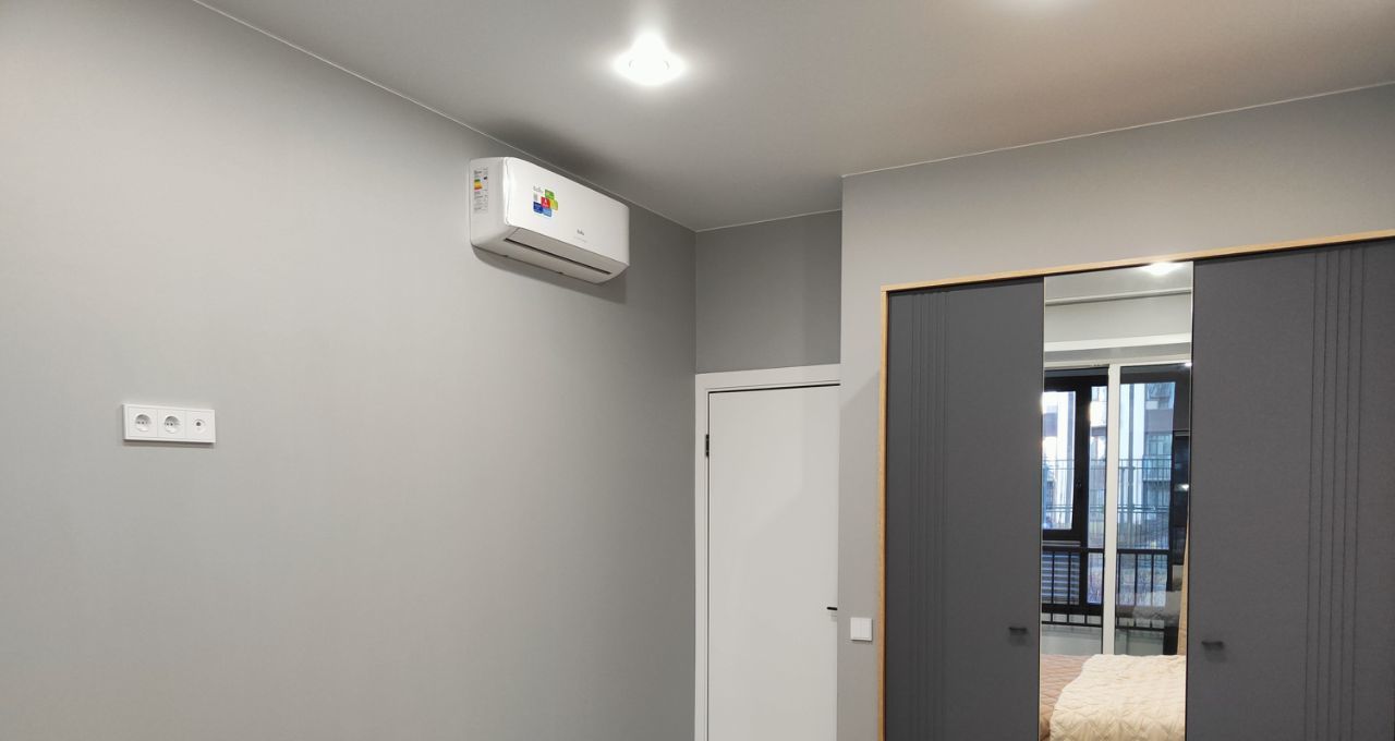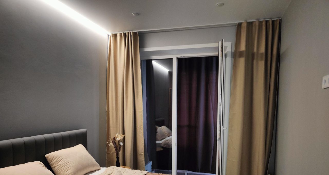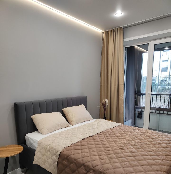 В квартире сделан дизайнерский ремонт, который создаёт современную и комфортную атмосферу. В просторной кухне-гостиной площадью 12,12 кв. м есть вся необходимая мебель и техника, включая телевизор и удобный двуспальный раскладной диван; в спальне - большая кровать, шкаф, прикроватные столики, кондиционер. Вид из окон на красивый двор. В совмещённом санузле - инсталляция, душевой поддон, стиральная машина, накопительный водонагреватель, электрический полотенцесушитель качественная сантехника. Большой балкон-лоджия на две комнаты с двумя входами, на окнах - шторы блэкаут, есть освещение и розетки, на полу - линолеум. Интернет - электронный город.