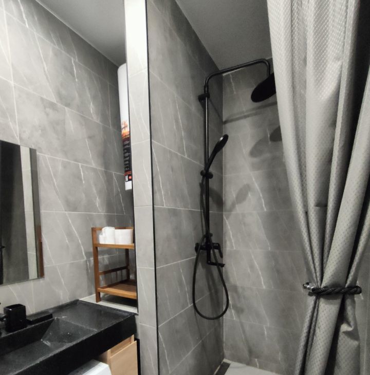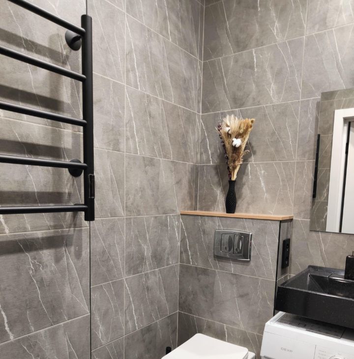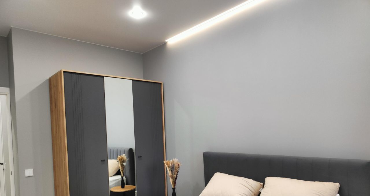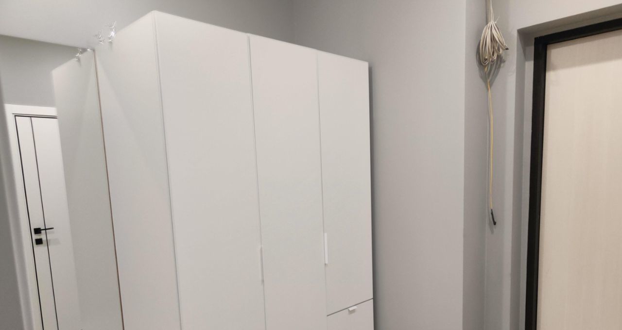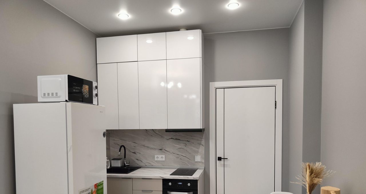 В квартире сделан дизайнерский ремонт, который создаёт современную и комфортную атмосферу. В просторной кухне-гостиной площадью 12,12 кв. м есть вся необходимая мебель и техника, включая телевизор и удобный двуспальный раскладной диван; в спальне - большая кровать, шкаф, прикроватные столики, кондиционер. Вид из окон на красивый двор. В совмещённом санузле - инсталляция, душевой поддон, стиральная машина, накопительный водонагреватель, электрический полотенцесушитель качественная сантехника. Большой балкон-лоджия на две комнаты с двумя входами, на окнах - шторы блэкаут, есть освещение и розетки, на полу - линолеум. Интернет - электронный город.