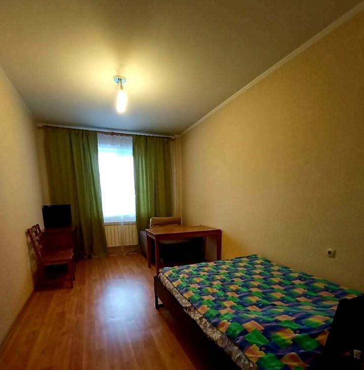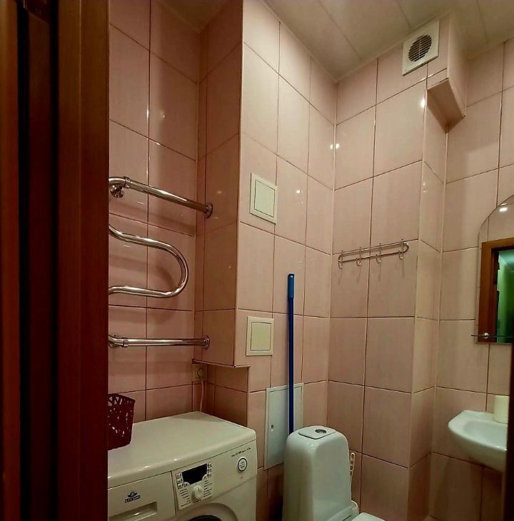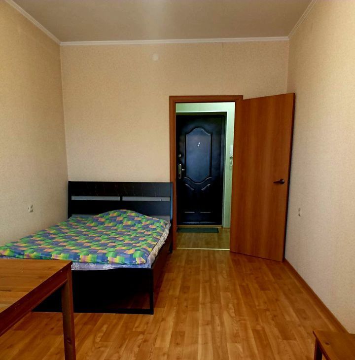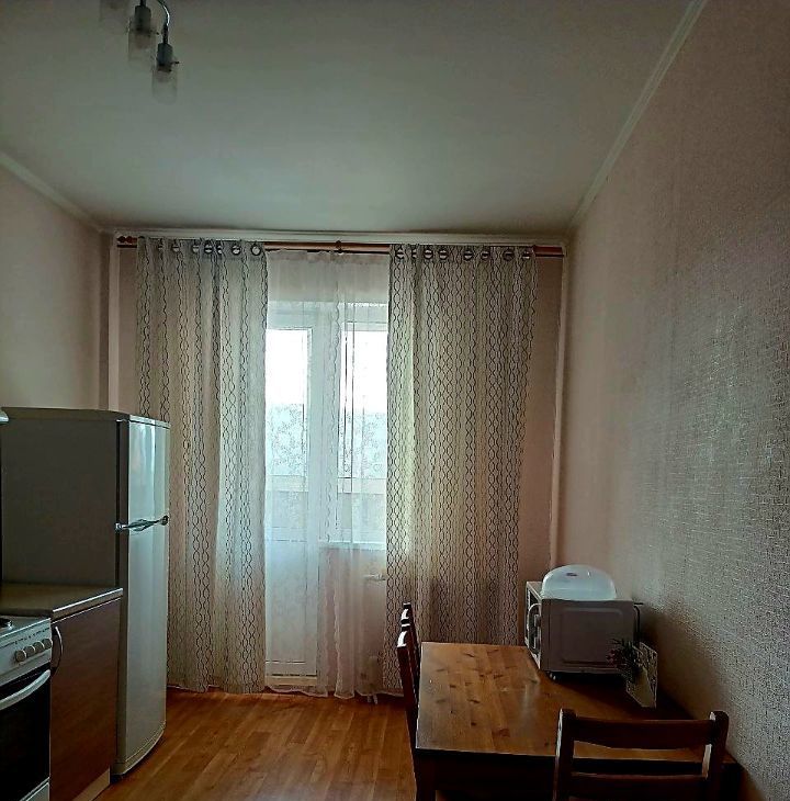 **КВАРТИРА (6/18 этаж):** Косметический ремонт. Большая комната с кроватью, рабочим столом и креслом. Отдельная кухня с техникой (холодильник, плита, СВЧ) и обеденным столом. Ванная комната с ванной и стиральной машиной. Гардеробная в прихожей. Большая лоджия.