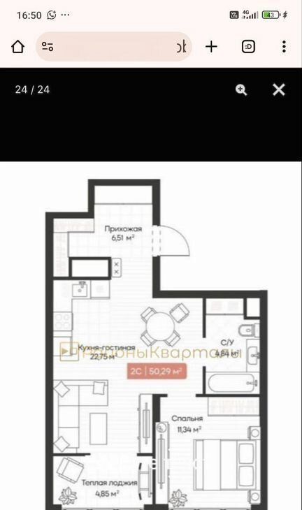 1-к кв. Новосибирская область, Новосибирск ул. Владимира Заровного, 24 (43.0 м²)
