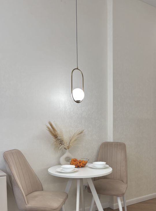 Комфортная кухня комплектована современной техникой, включая холодильник, микроволновую печь, двухкомфорочную плиту и духовой шкаф. Приятная обеденная зона с мягкими стульями и удобным круглым столом.