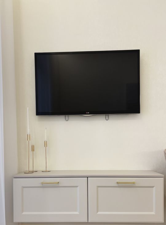 В зоне отдыха — мягкий диван, который раскладывается; здесь могут разместиться гости. В ТВ-зоне есть тумба и телевизор.