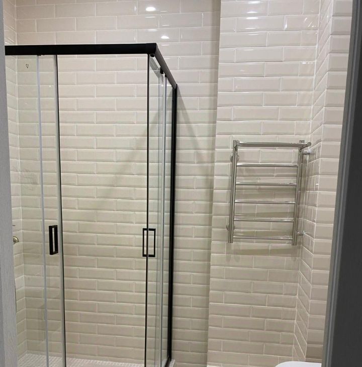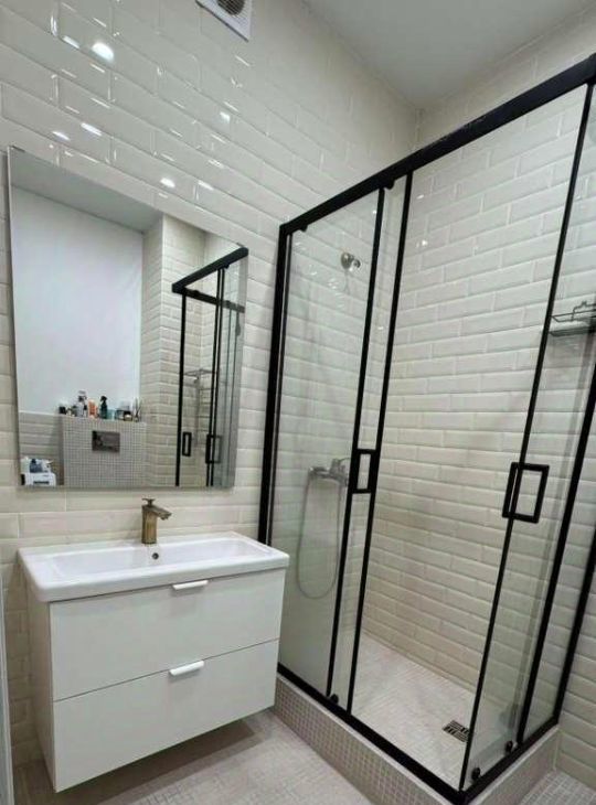 Ванная с просторной душевой кабиной, большим зеркалом, большой раковиной, вместительными шкафчиками для хранения. Хороший напор воды.