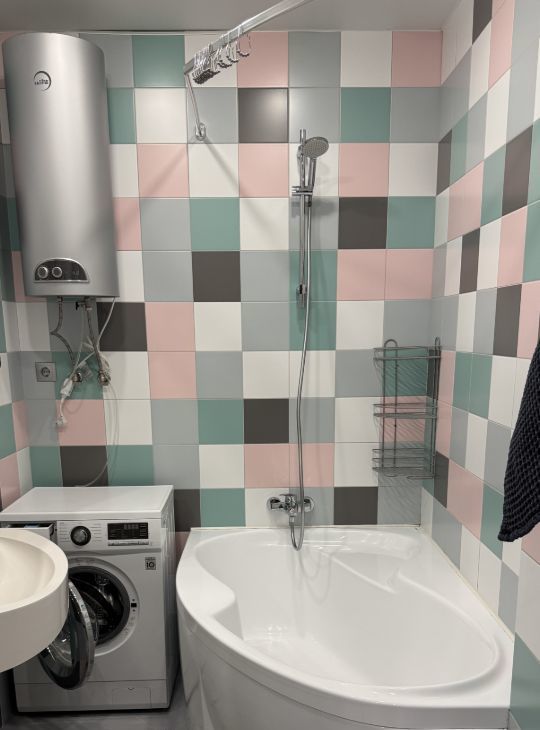 Ванная комната совмещенная, оформлена современной плиткой, установлена ванна, инсталляция, гигиенический душ, шкаф для хранения и водонагреватель.