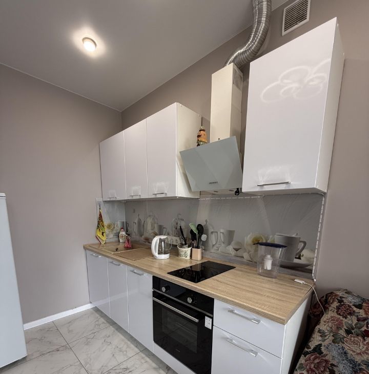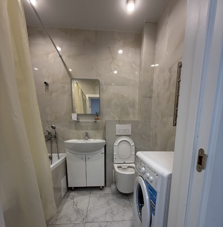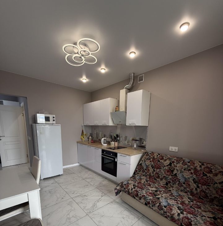 Квартира с евроремонтом и полностью готова к проживанию. В комнате и на кухне есть вся необходимая мебель. На кухне установлена современная техника, включая холодильник и стиральную машину. В совмещенном санузле — ванна, что обеспечит комфортные условия для гигиенических процедур.