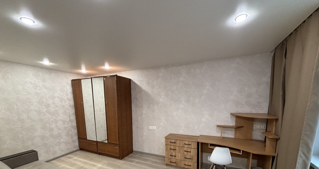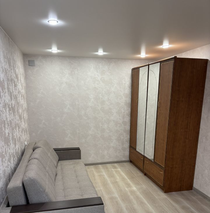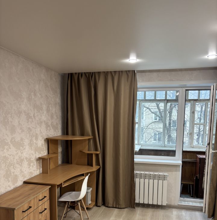 Квартира расположена на третьем этаже панельного дома. В квартире выполнен косметический ремонт, что создает уютную атмосферу. Просторная жилая комната оборудована шкафами и компьютерным столом, а также имеется диван.