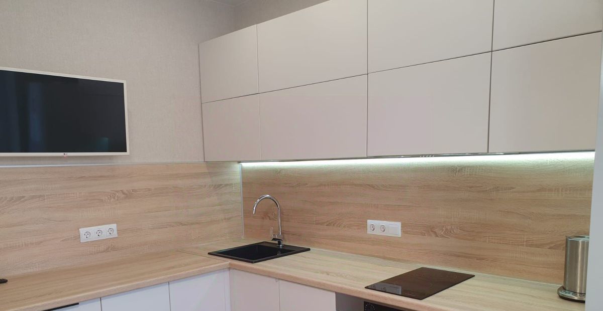 На кухне большой балкон-лоджия, с панорамными окнами.