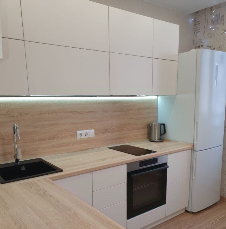Диван 160/200., кухонный стол с 4мя стульями, кухонный гарнитур со встроенной бытовой техникой, смарт TV, Wi-Fi, холодильник ,сушилка напольная для белья., чайник, микроволновая печь, духовая печь, варочная панель, вытяжка над варочной панелью, посудомойка, стиральная машина.