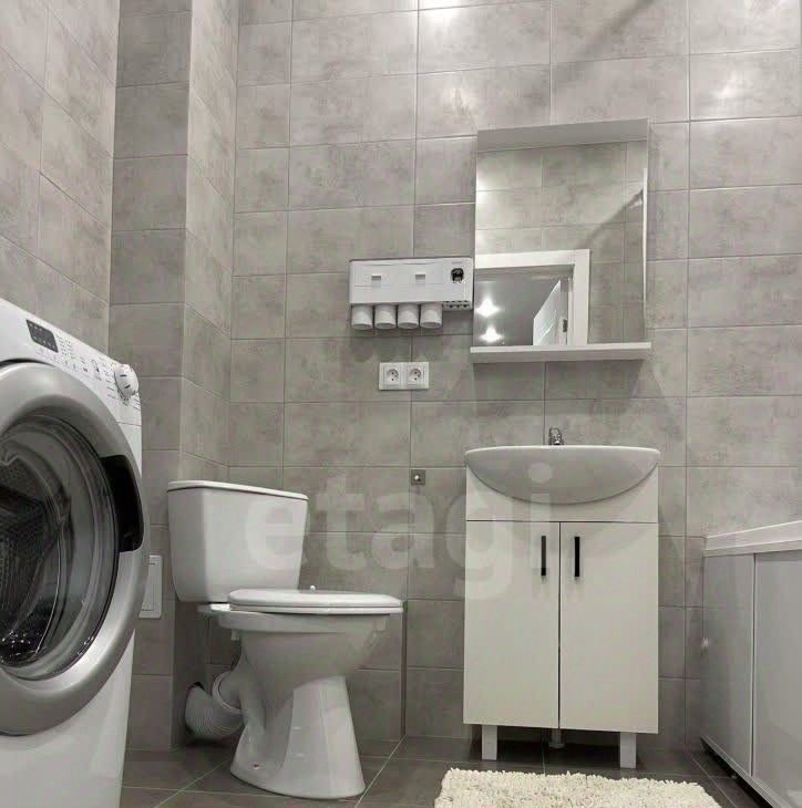Ванная комната: Здесь есть всё для вашего удобства: многофункциональная стиральная машина, вместительный шкафчик и практичные полки.