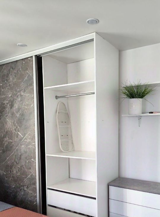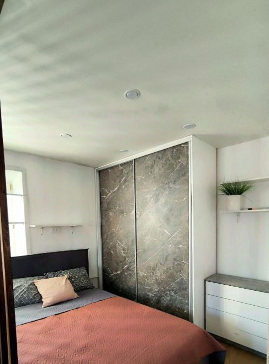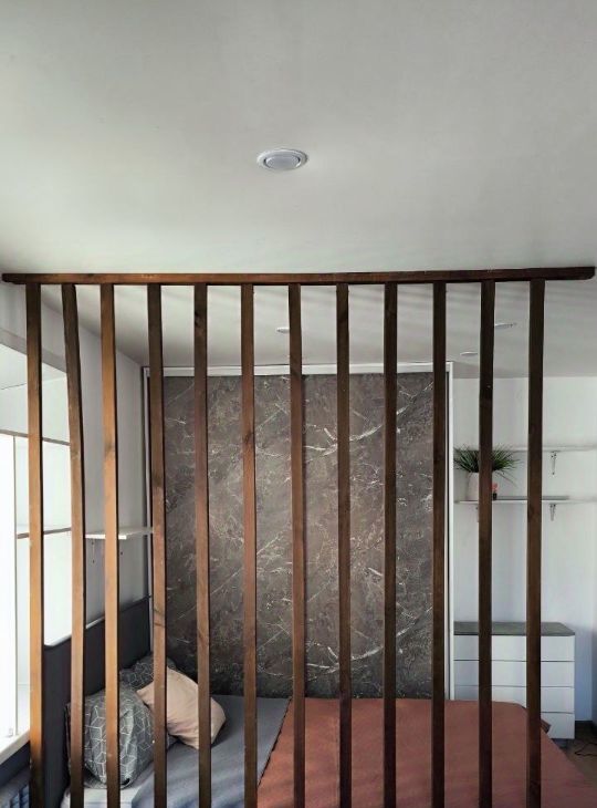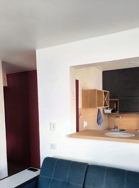 Площадь и планировка:31 м². Кухня, гостиная с диваном (есть хранение) и визуально изолированная спальная зона с кроватью (есть хранение - подъемный механизм), санузел, коридор.