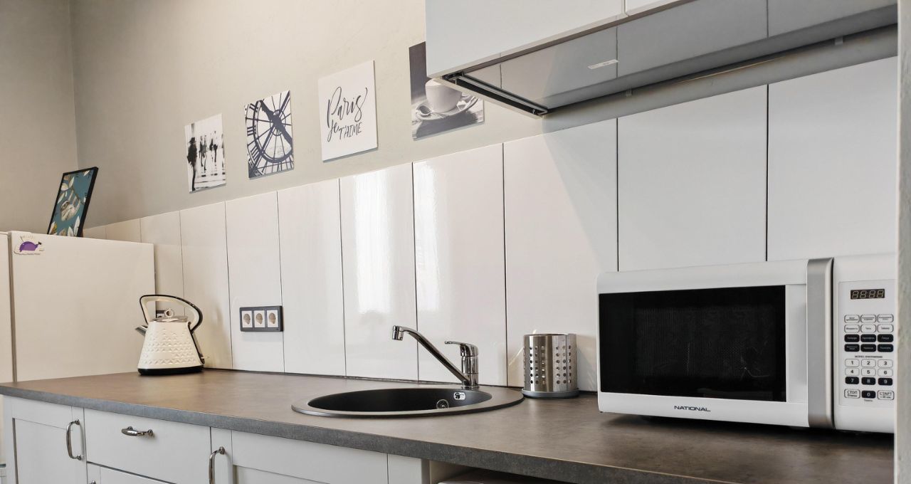 - Чайник, микроволновая печь, индукционная плита, холодильник, комплект необходимой посуды.