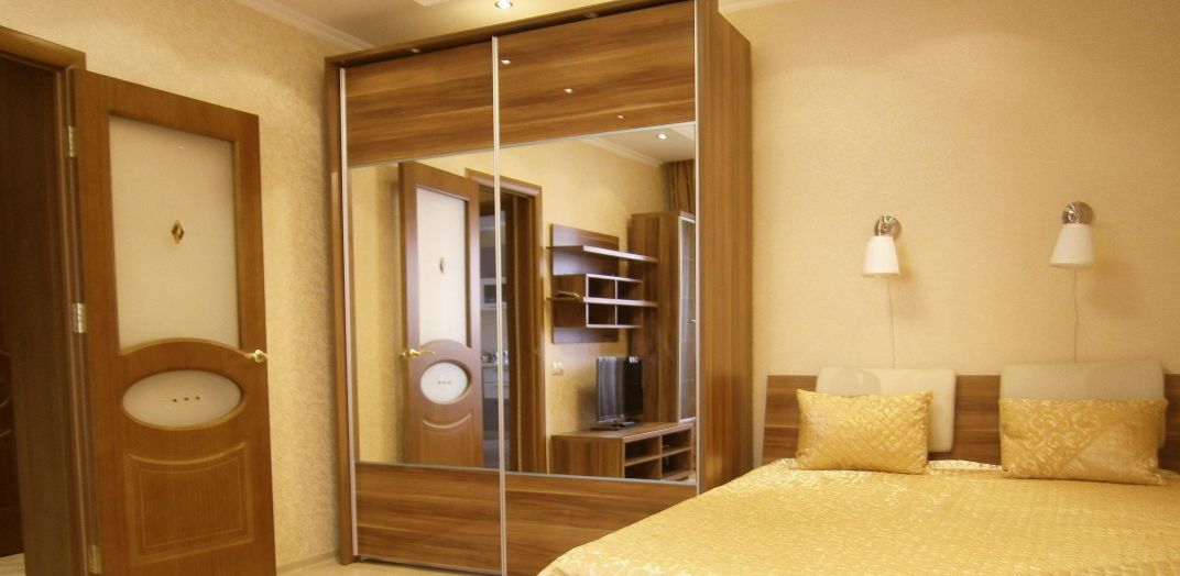 В комнате большой вместительный шкаф купе, угловой кожаный диван, двуспальная кровать, горка.