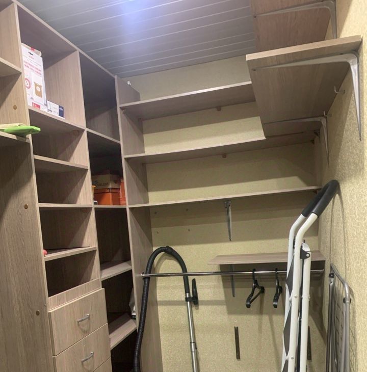 - Площадь и планировка: 51,6 м² — общая площадь квартиры. Просторная квадратная комната, кухня 12 м² и отдельная гардеробная с полками для вещей (выделена из части коридора).