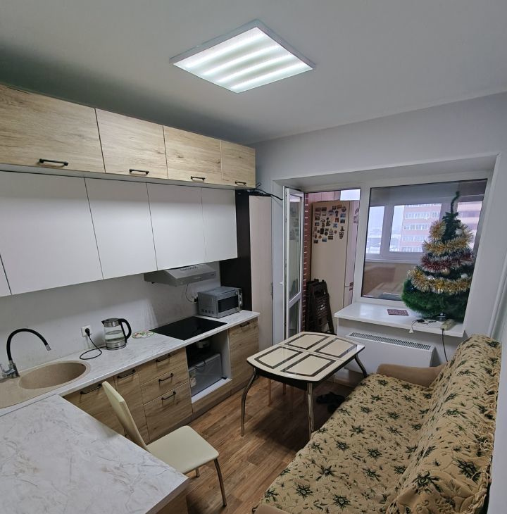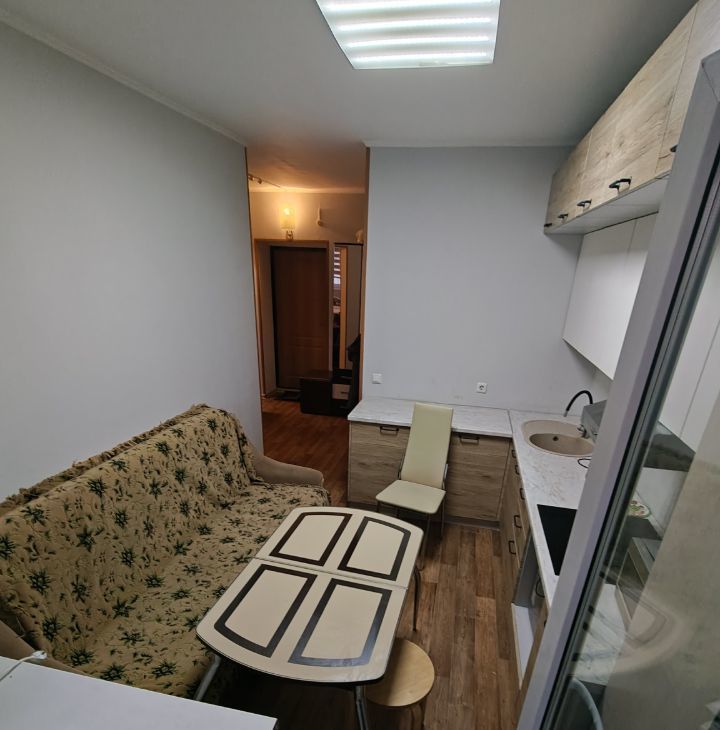 Планировка: Изолированная комната, просторная кухня, совмещенный санузел.