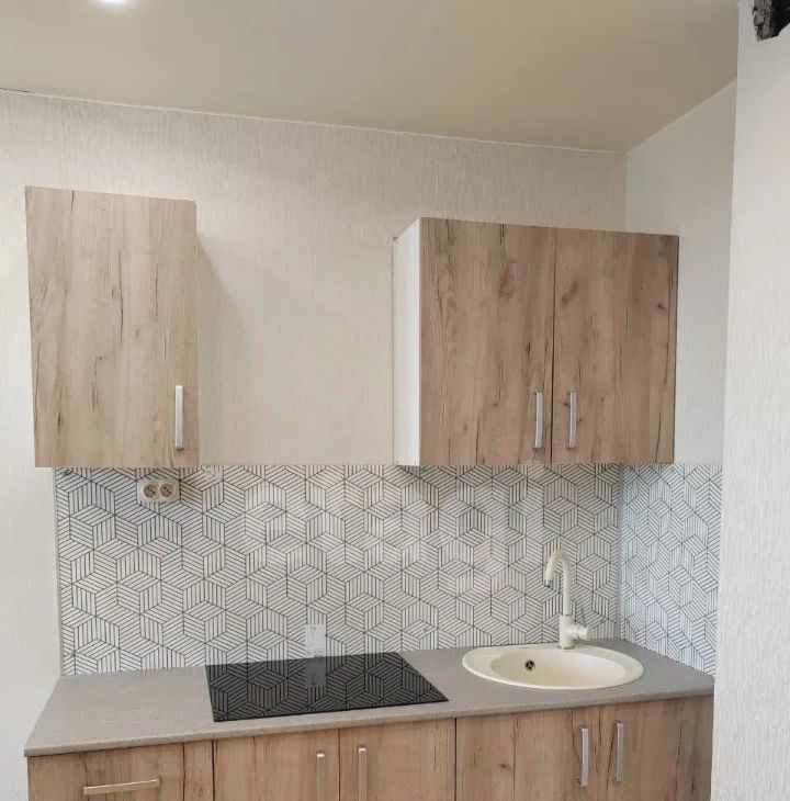 Кухня оборудована кухонным гарнитуром, варочной панелью и мойкой. Есть удобная зона для приготовления пищи и хранения кухонных принадлежностей.
