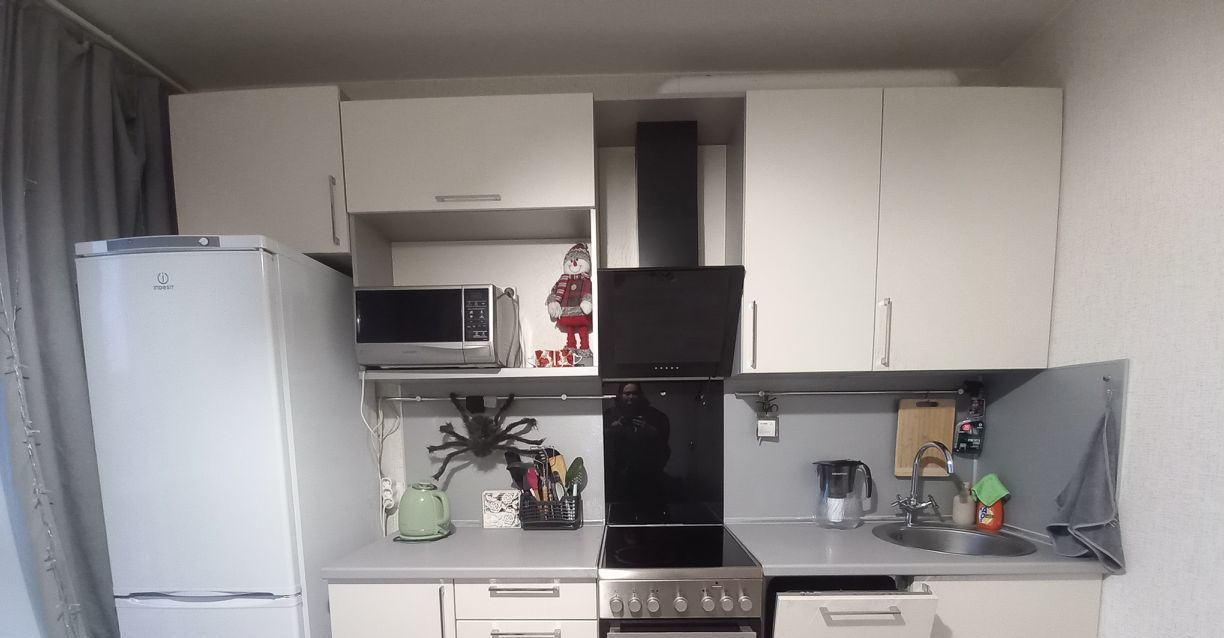 Их техники: кухонная плита, микроволновая печь, чайник, холодильник, посудомоечная машина, стиральная машина.