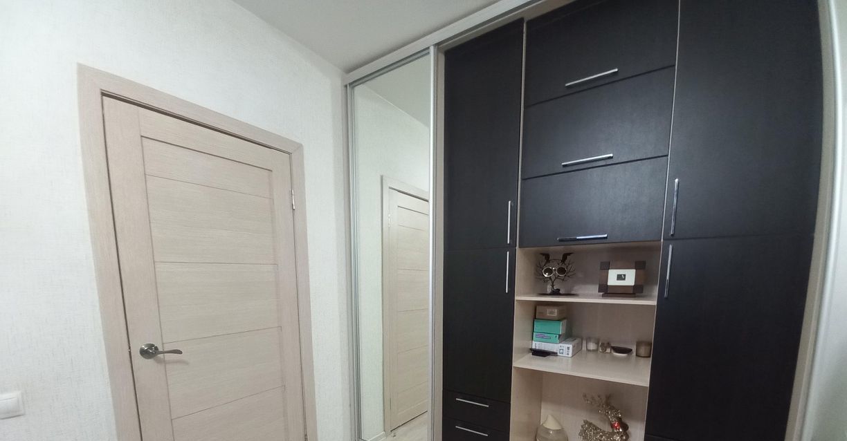 Из мебели в квартире: Встроенный шкаф в спальне, двухспальная кровать, кухонный гарнитур, стол, стулья, шкаф в ванной комнате, вешалка в коридоре.