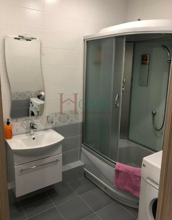 В ванной комнате — душевая кабина и стиральная машина.