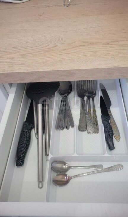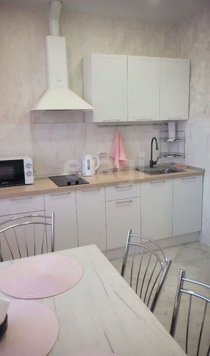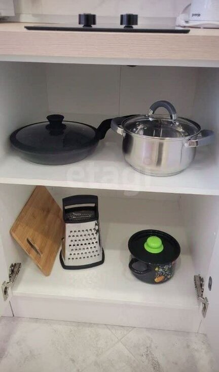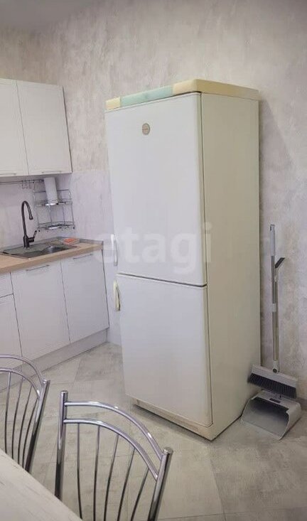 Есть все необходимое для проживания: кухонный гарнитур, посуда, холодильник, чайник, микроволновая печь, стол, стулья.