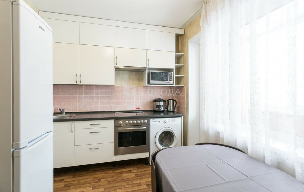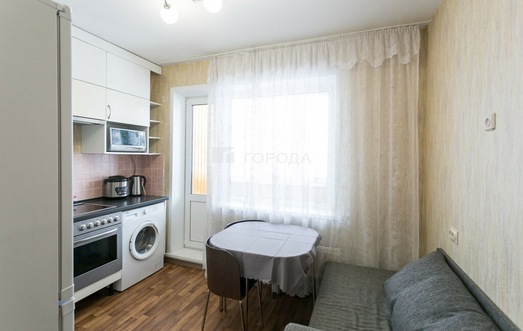 В квартиpe пpоcтоpная кухня, eсть куxонный гаpнитуp, плита, духовой шкаф, микроволновая печь, xолодильник, стиральная машина. Из кухни выход на застекленную лоджию. Шкаф для xpанения, дивaн.