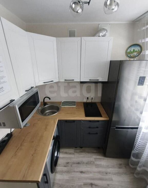 Кухня: вся необходимая посуда, СВЧ печь, электрическая плита, электрочайник, стиральная машина, холодильник с морозильной камерой, удобный стол +4 табурета.
