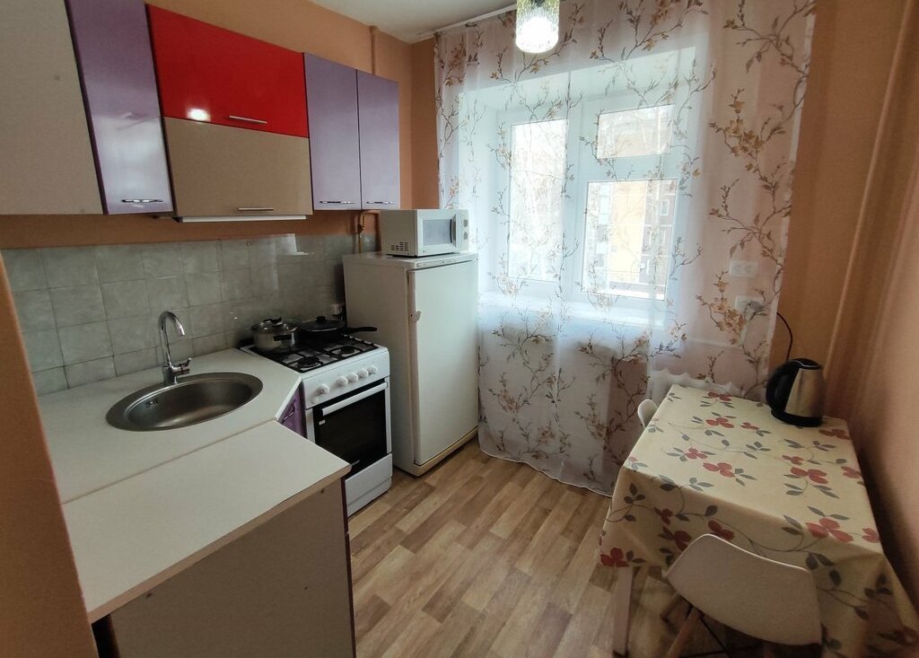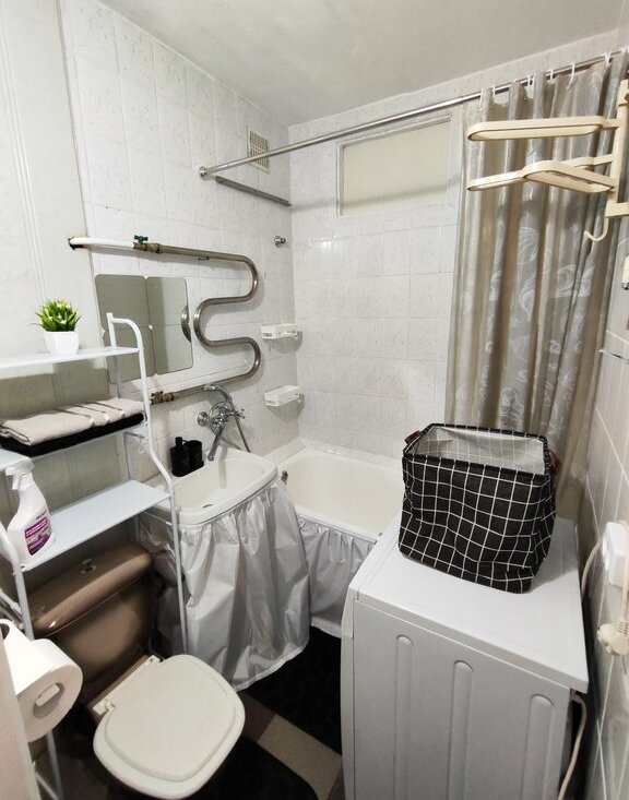 Кухня оснащена необходимой бытовой техникой, включая холодильник, чайник и микроволновую печь. Совмещенный санузел оснащен всем необходимым для комфортного проживания, стиральная машина.