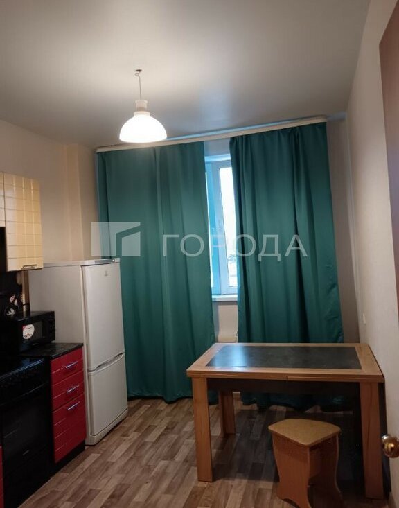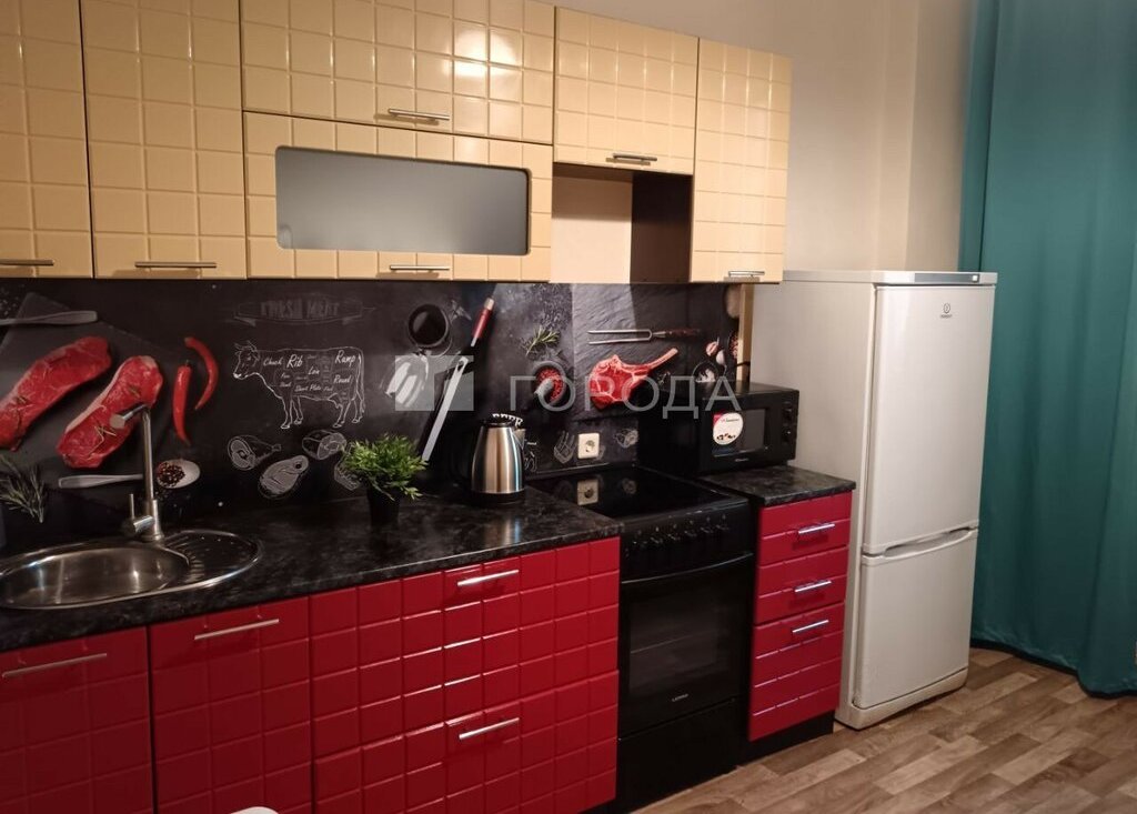 Кухня оснащена всей необходимой мебелью и бытовой техникой: холодильником, микроволновкой, электрочайником, кухонным гарнитуром, посудой, электрической плитой, столом обеденным, стиральной машинкой-автомат. В квартире расположен балкон, а окна выходят во двор, откуда открывается вид на парковку.