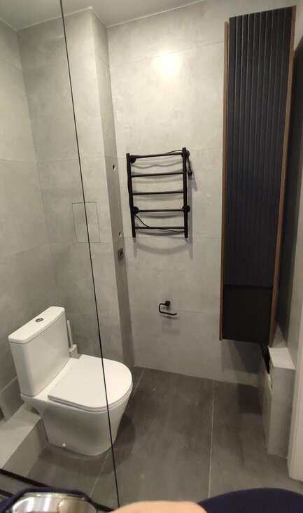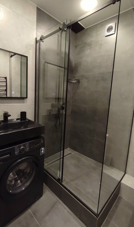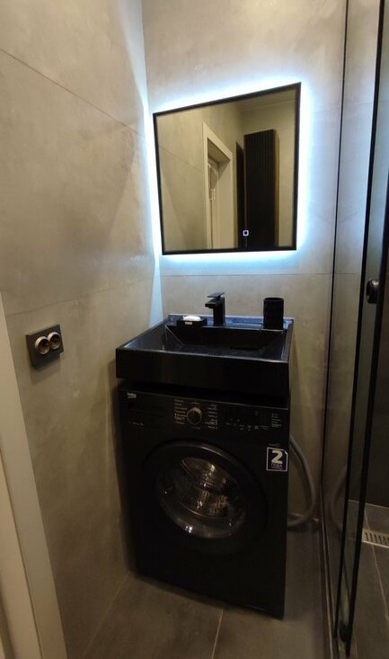 В санузле установлена: современный душевой угол с качественной сантехникой, унитаз, стиральная машина, зеркало с подсветкой, электрический полотенцесушитель и шкаф-пенал.