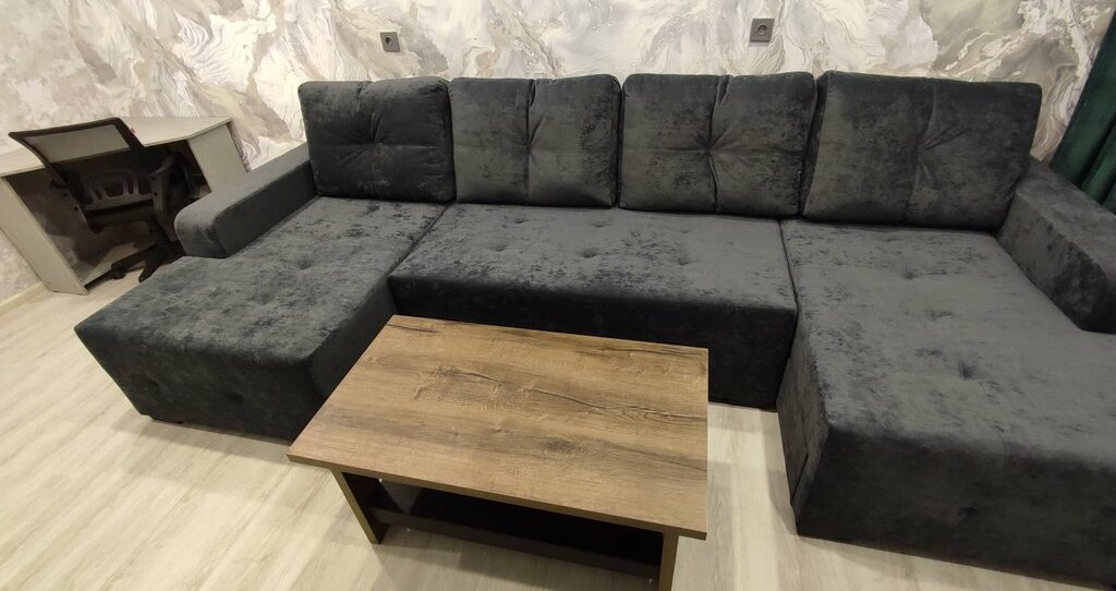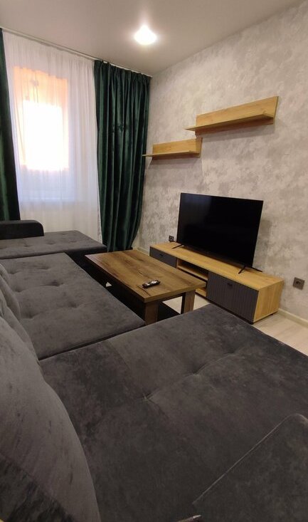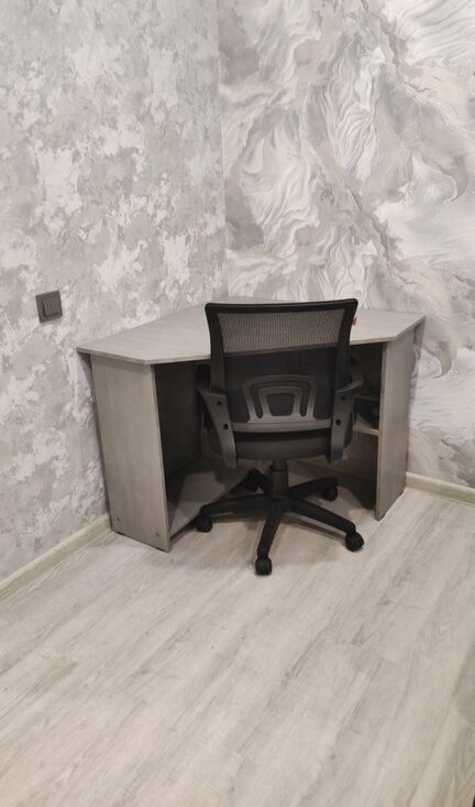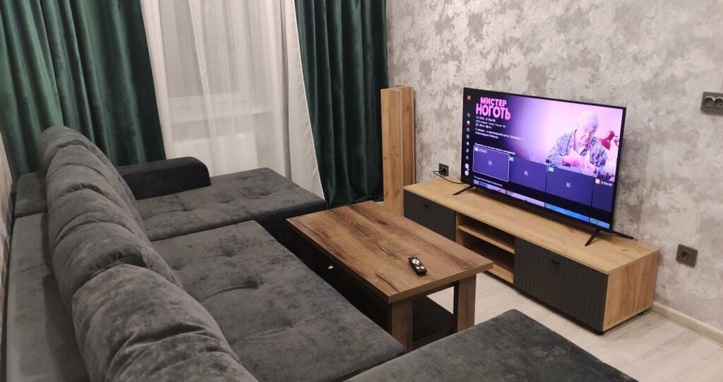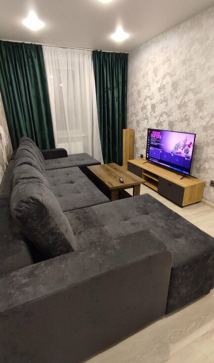 В комнате установлен угловой компьютерный стол, огромный новый диван на пружинном блоке с раскладкой "Тик-так", журнальный столик, телевизор 55ая диагональ Smart TV и тумба под телевизор.