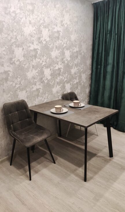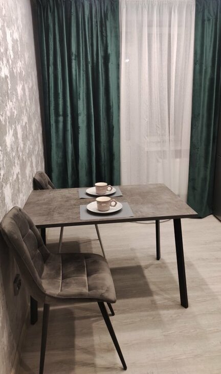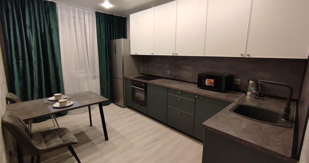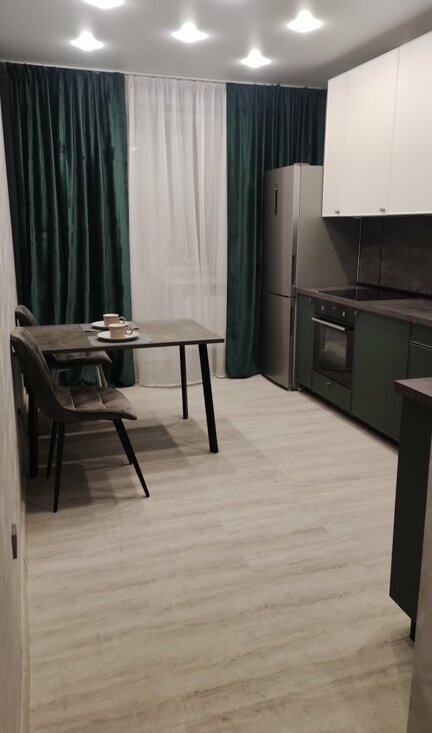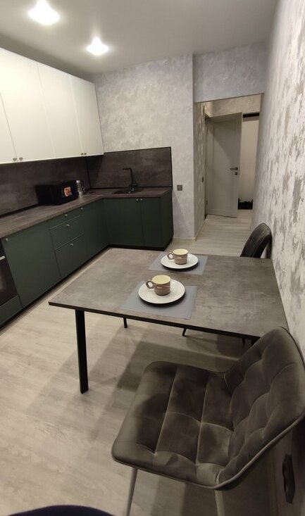 Выполнен современный ремонт в светлых тонах, установлен качественный кухонный гарнитур с вместительными шкафами, обеденная зона и необходимая посуда.