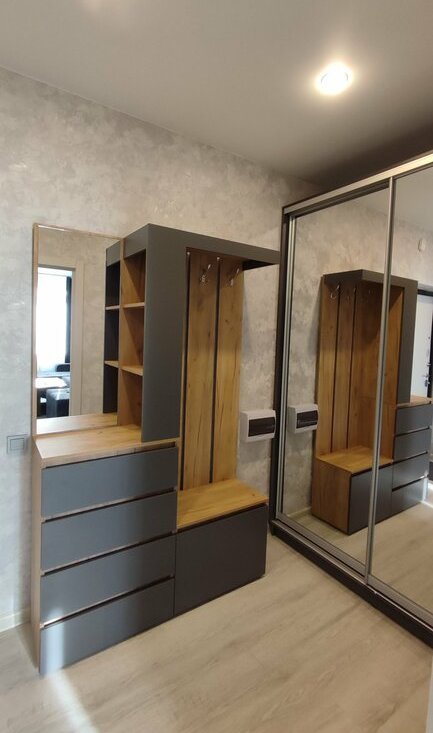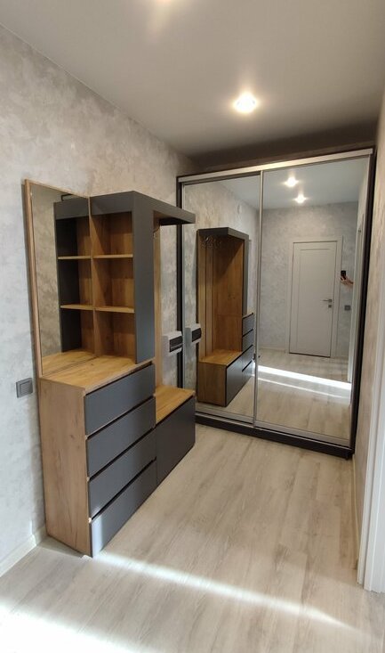 В коридоре установлен большой Шкаф-купе с зеркалами и вместительная прихожая.