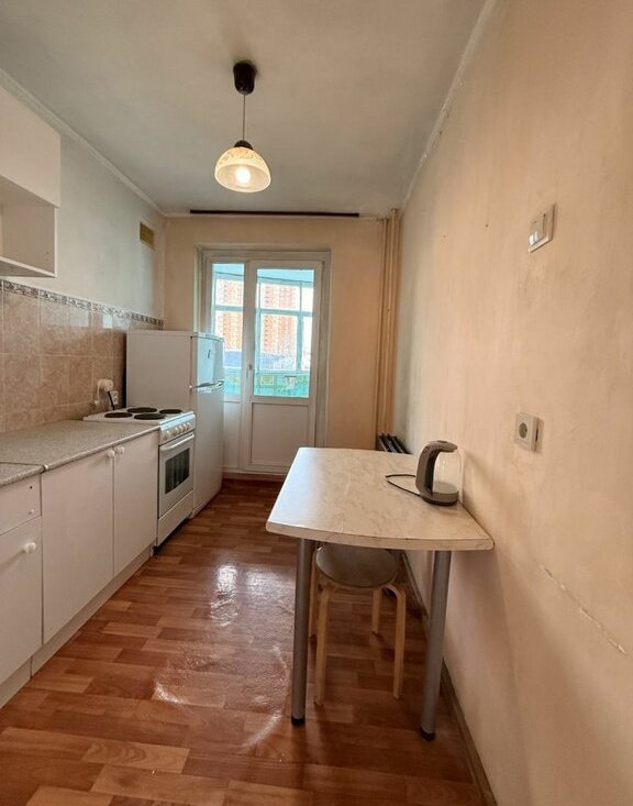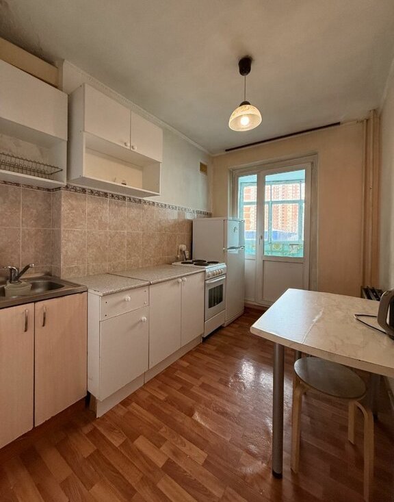 В комнате стоит шкаф и диван, на кухне стол, кухонный гарнитур.