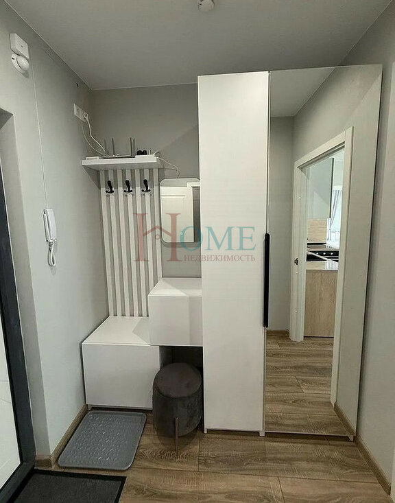 В коридоре расположен вместительный шкаф с большим зеркалом и мягким пуфиком.