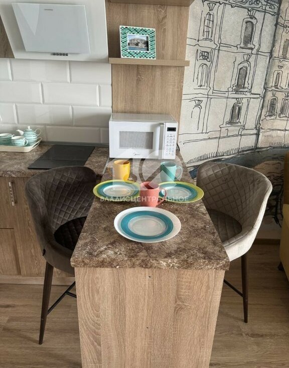 Квартира расположена в современном кирпичном доме 2018 года постройки, на 18 этаже, с видом на улицу. Общая площадь — 29,8 кв. м, из которых 21,8 кв. м — жилая площадь, 5 кв. м — кухня. Высота потолков — 3 метра, что создаёт ощущение простора и свободы.
