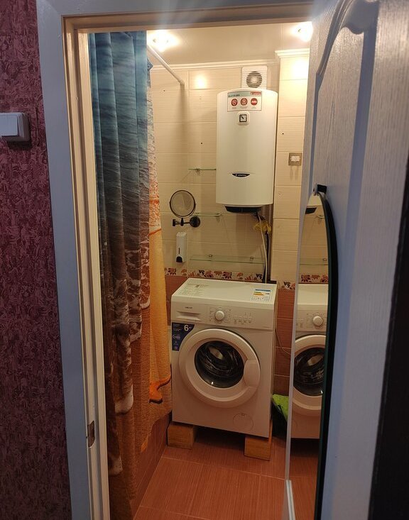 В квартире, диван, кровать, микроволновка, чайник, стиральная машина.