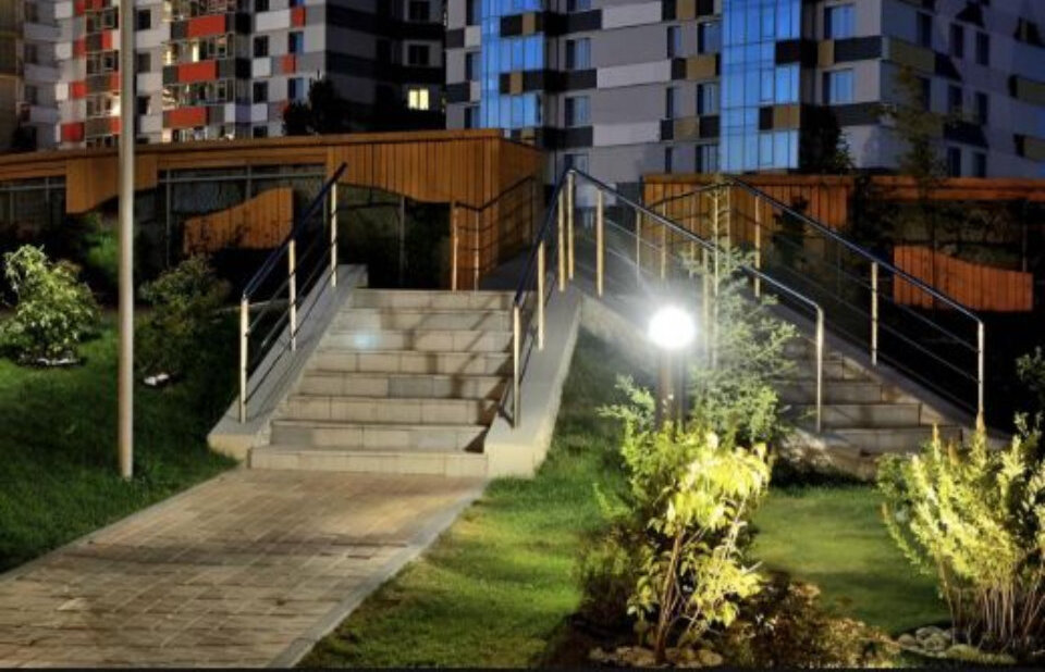 - крупномерные деревья и кустарники, фонтан с подсветкой, детские и спортивные площадки, велосипедные и прогулочные дорожки.