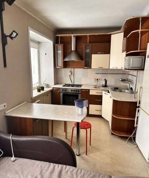 В квартире выполнен косметический ремонт, что создаёт приятную атмосферу. Просторная кухня площадью 6 м² оснащена необходимой бытовой техникой, включая холодильник и микроволновую печь. В комнате установлен шкаф и диван, а также имеется гардеробная. Санузел совмещённый, оборудован ванной. Из окон открывается вид на тихий двор, где есть детская и спортивная площадки.