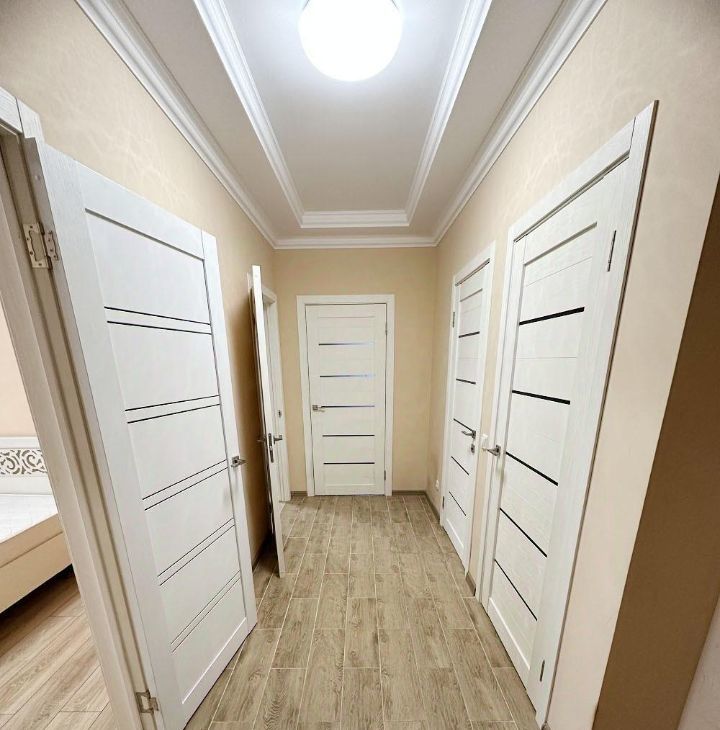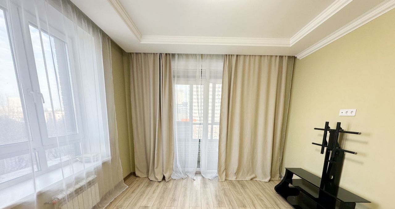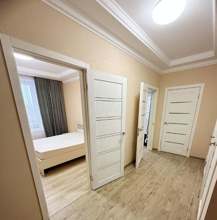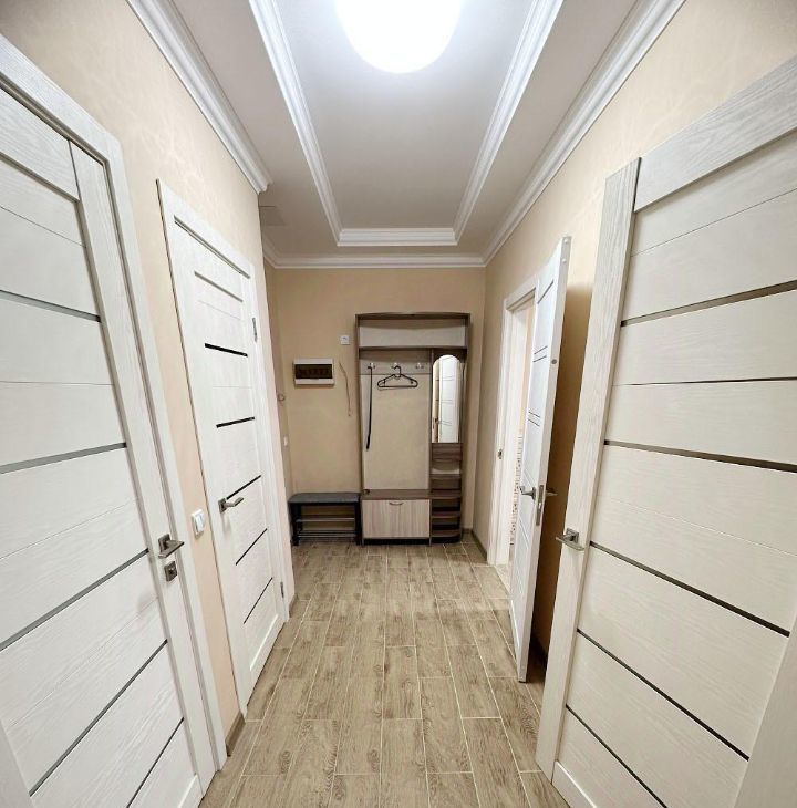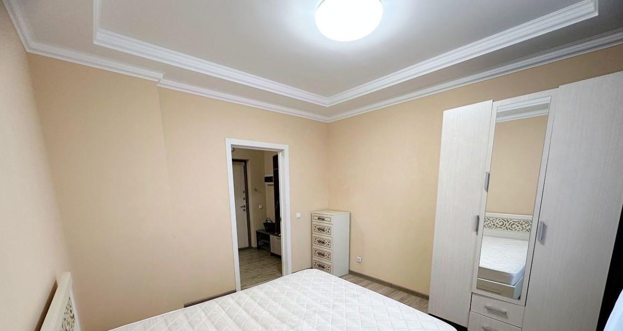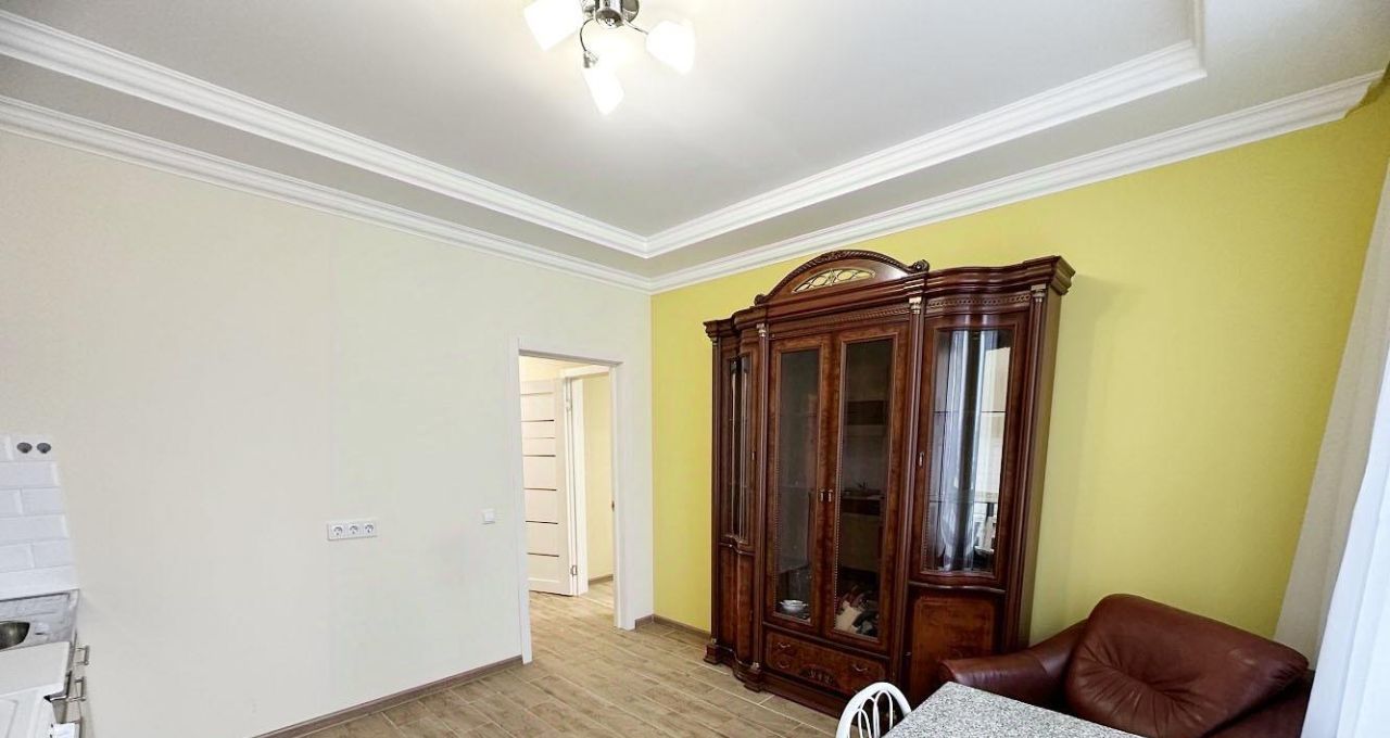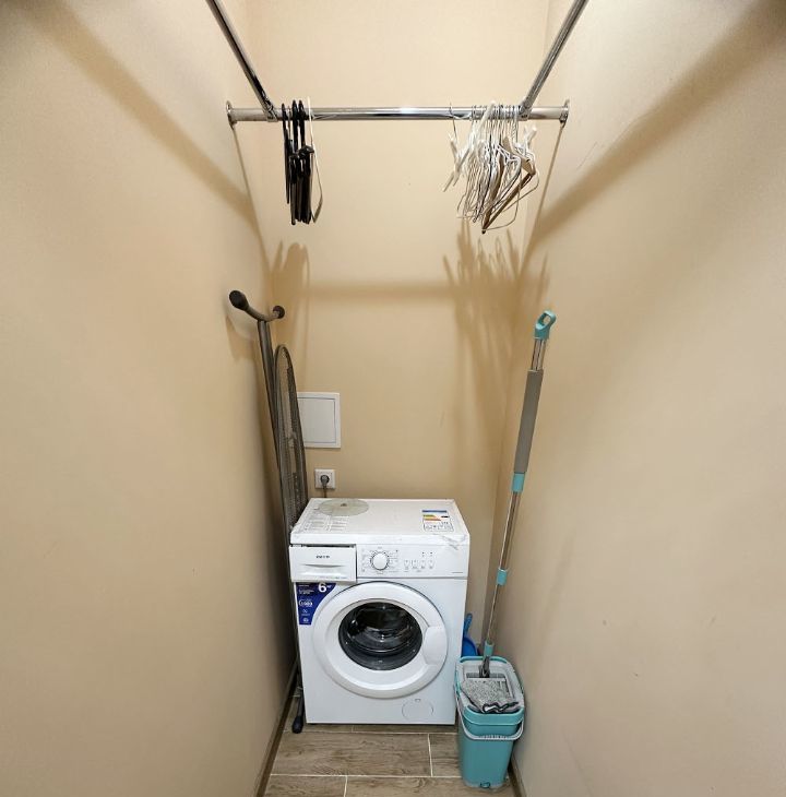 Квартира с удобной планировкой: две комнаты и большая кухня, есть отдельная небольшая гардеробная.