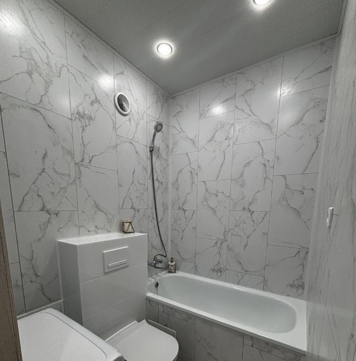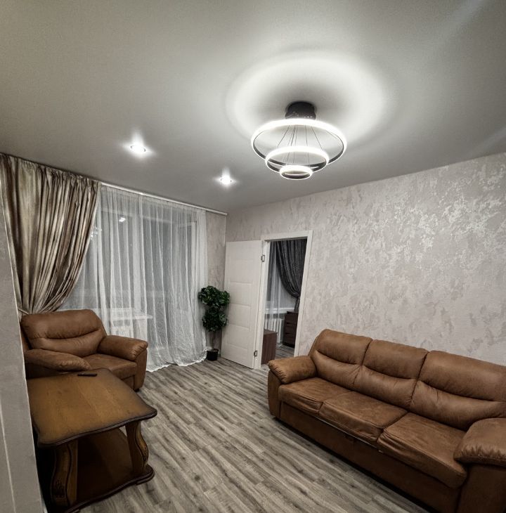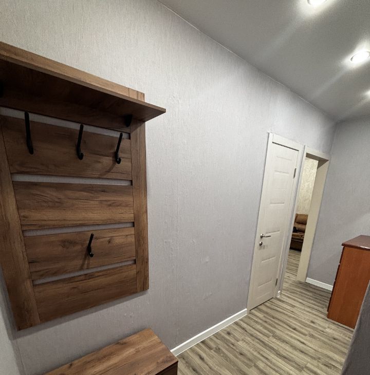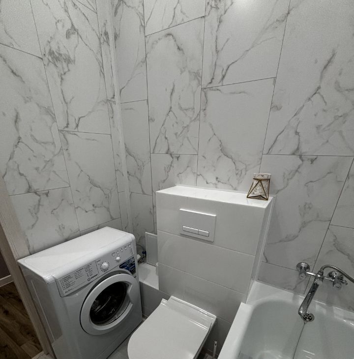 Гостиная с качественным диваном, креслом, журнальным столиком и зоной ТВ. Также имеется гардеробная со всеми необходимыми местами хранения. В совмещенном санузле есть стиральная машина автомат.