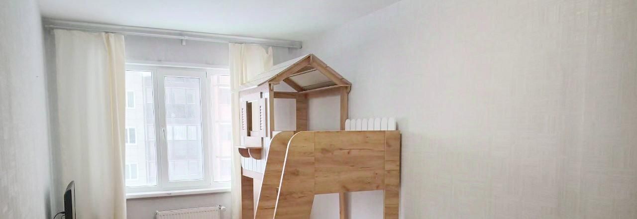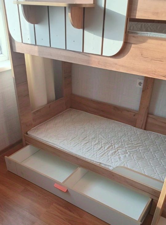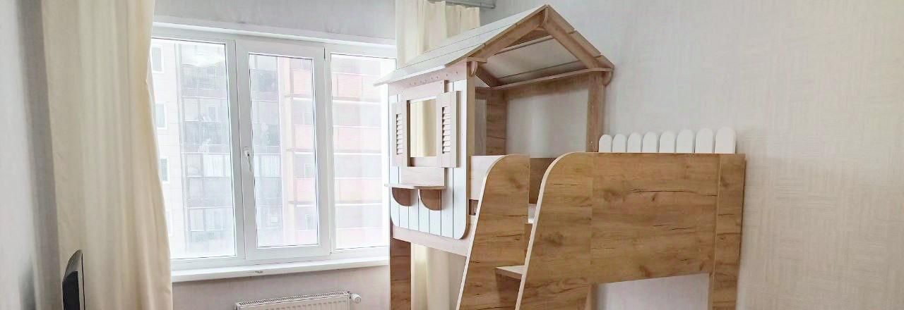 В комнате 18,5 кв м сделана на заказ вместительная гардеробная до потолка, двухъярусная кровать-домик на два спальных места (внизу в выдвижных ящиках можно хранить детские вещи или игрушки). Раскладной диван на 140х200 спальное место, тумба с ТВ.
