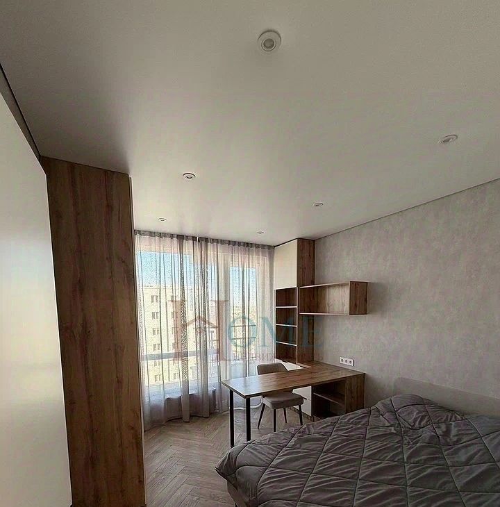 В спальне — большая кровать и рабочая зона с письменным столом.
