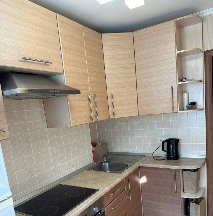 Новым владельцам оставим кухонный гарнитур со встроенной техникой и холодильник.