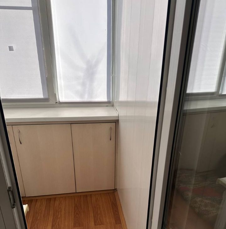 - застекленная лоджия с аккуратными шкафчиками для хранения