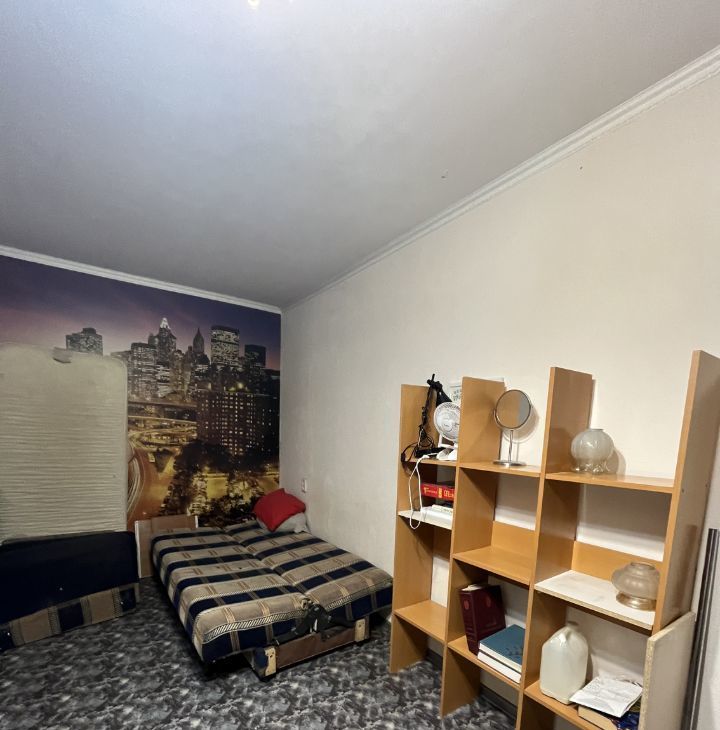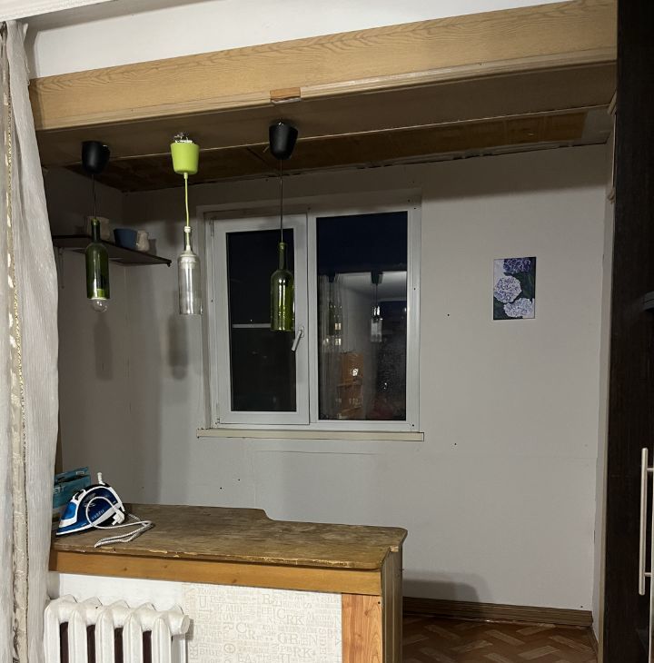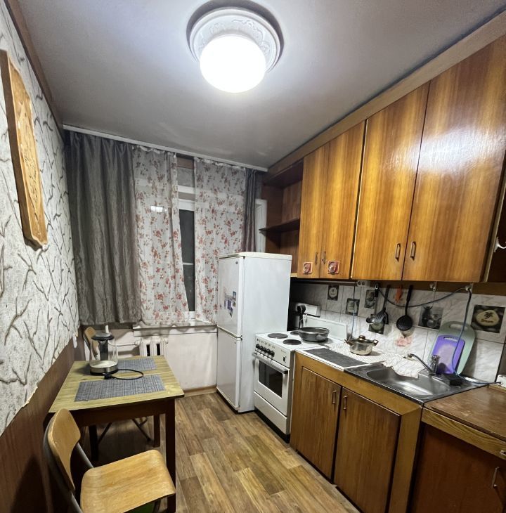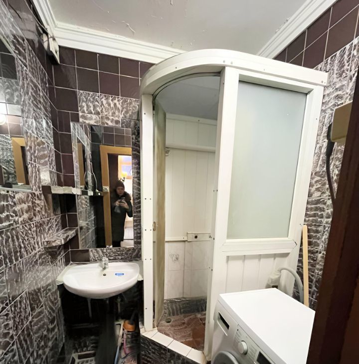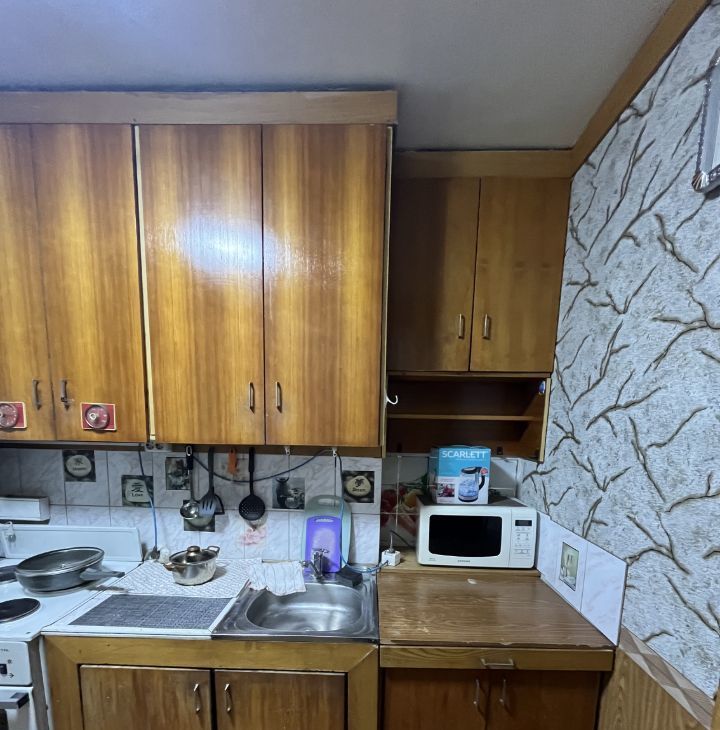 Кухня площадью 6 м² оборудована необходимой техникой: холодильник, плита, микроволновая печь. Из мебели — шкафы и обеденный стол. Диваны требуют ремонта или замены. В ванной комнате установлена стиральная машина.