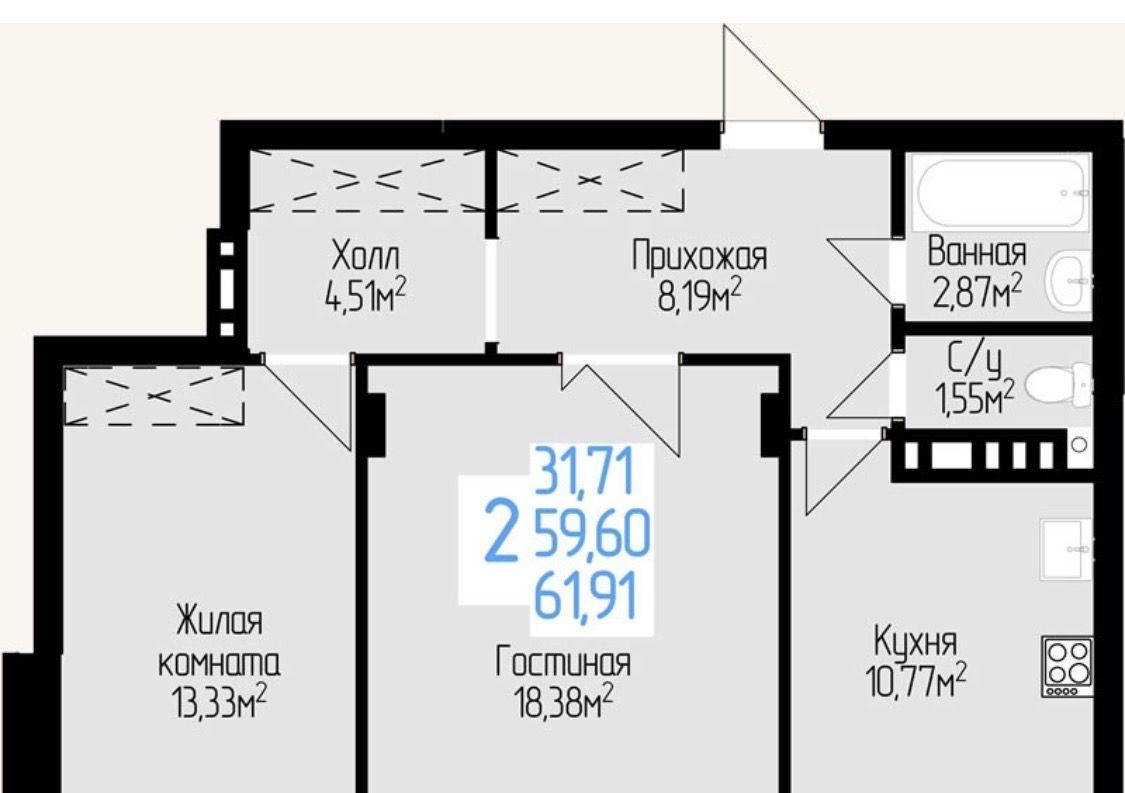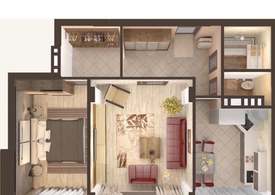 - Удачная планировка, позволяющая переделать квартиру в 3-студию