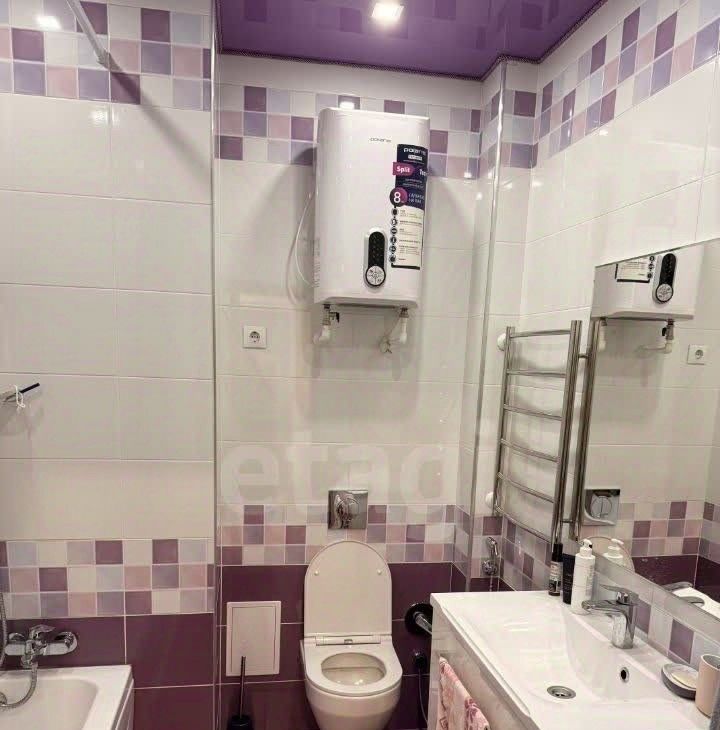 Ванная комната совмещенная, оформлена в современном стиле с использованием ярких акцентов. Из окон открывается приятный вид на городскую панораму.