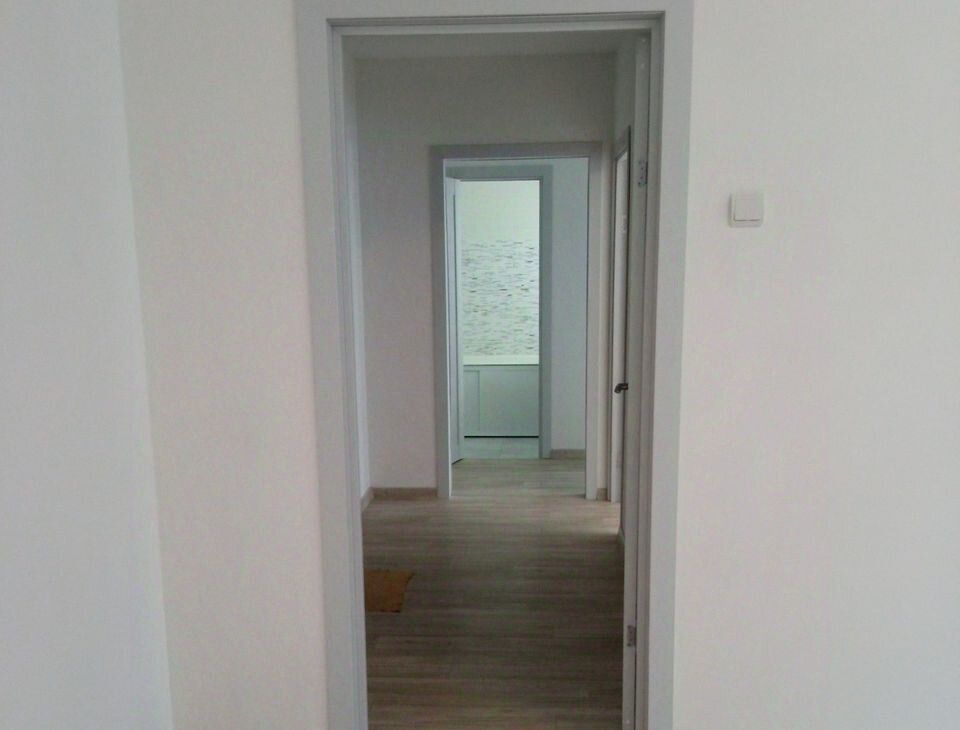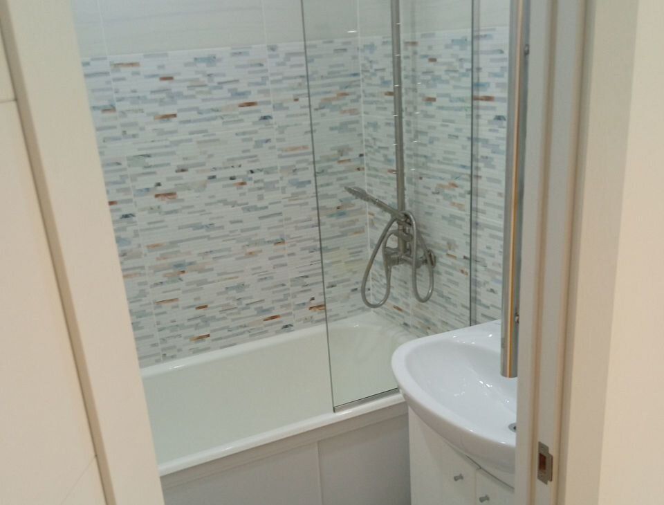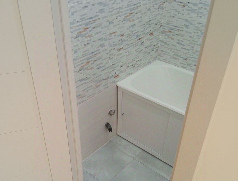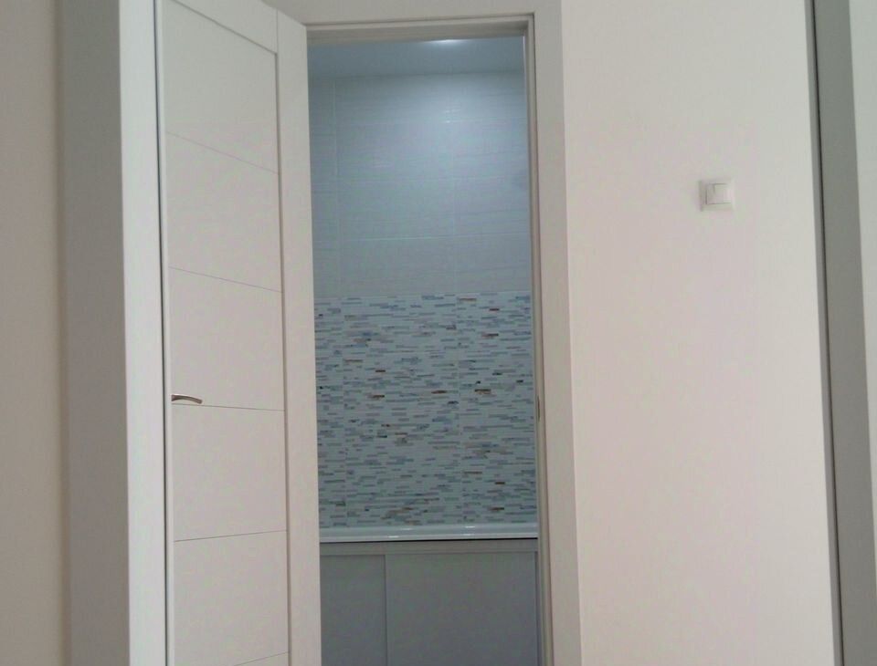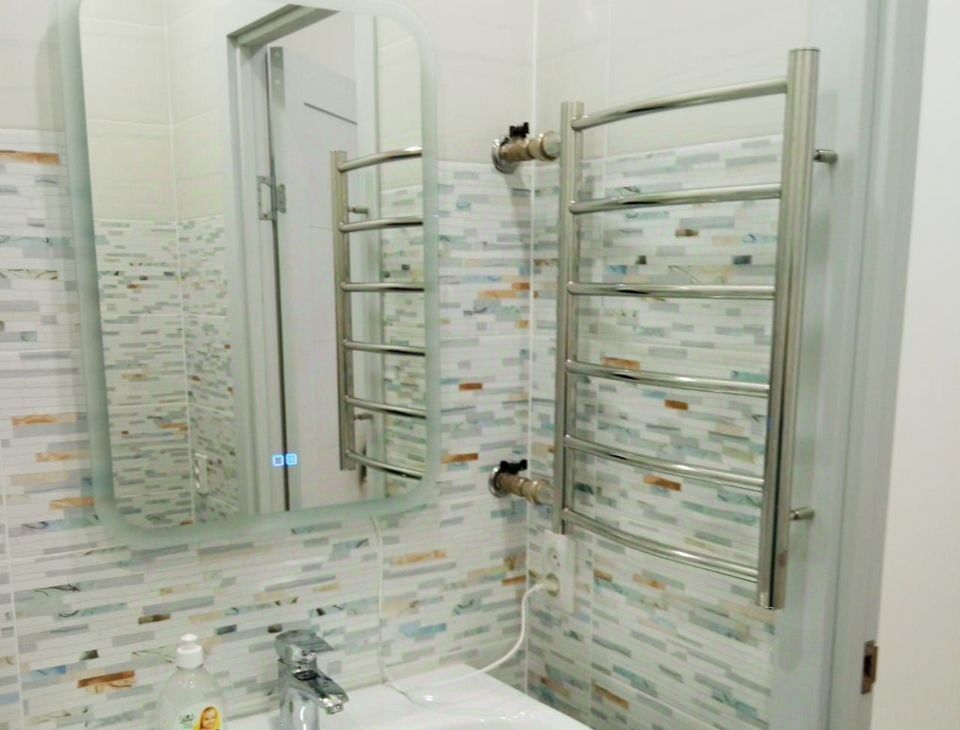 В квартире раздельный санузел (глубокая чугунная ванна 225л, безободковый унитаз, тропический и гигиенический души, подводка для стиральной машины, зеркало с подогревом и подсветкой), полукоммерческий линолеум, застекленный балкон с отделкой, натяжные потолки, скрытые карнизы, ламинированные межкомнатные двери и телескопические наличники, ровный пол без порожков. Сантехника и отделочные материалы новые, стены подготовлены для оклейки обоями. У экрана под ванну раздвижные дверцы из алюминиевой композитной панели толщиной 3 мм. Современный материал из алюминия и полимера, не бьется, не гнется, не желтеет.