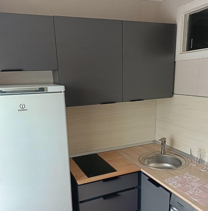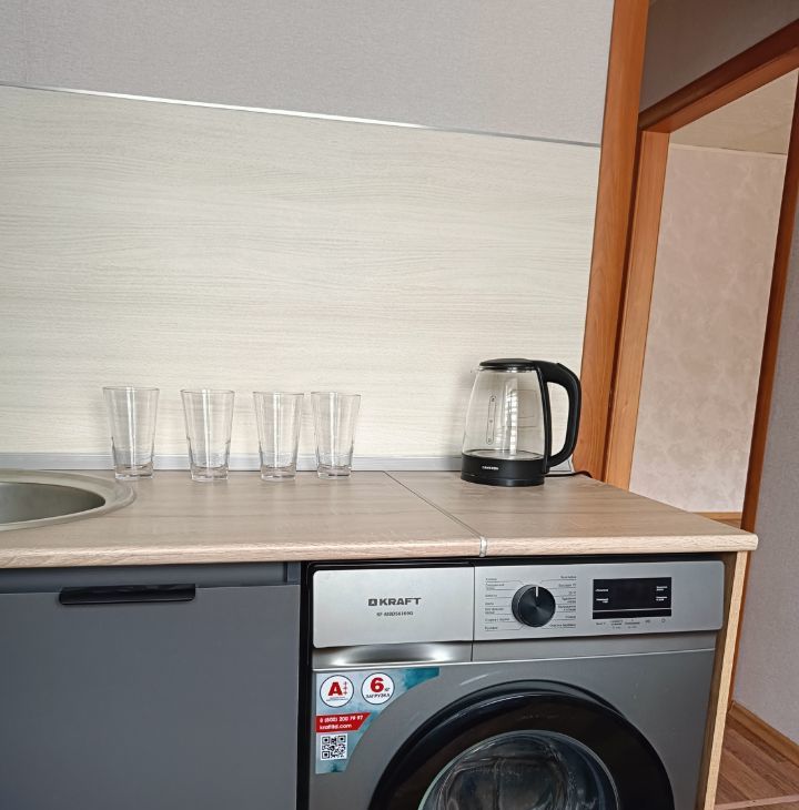 Кухня оборудована необходимой техникой: холодильником, плитой и стиральной машиной.