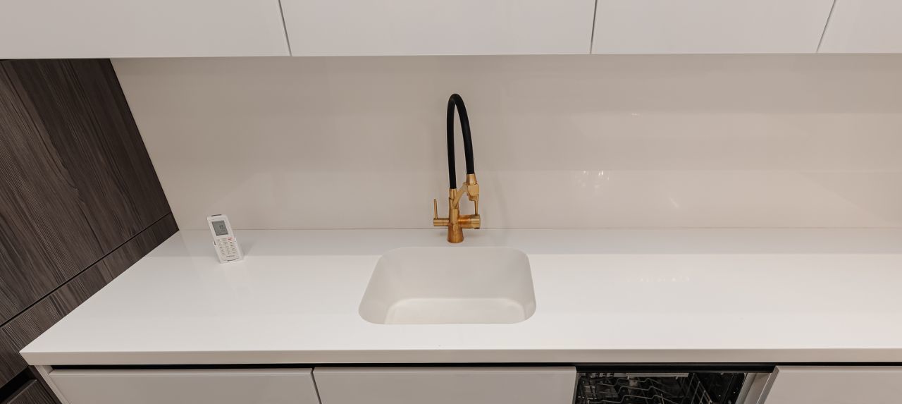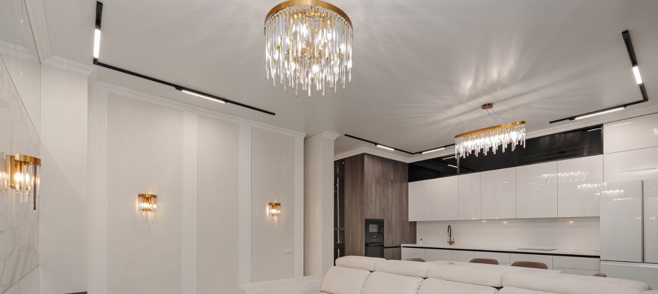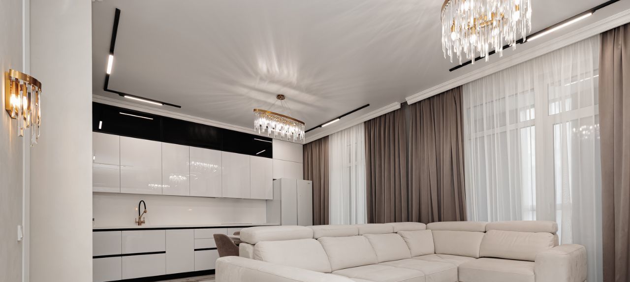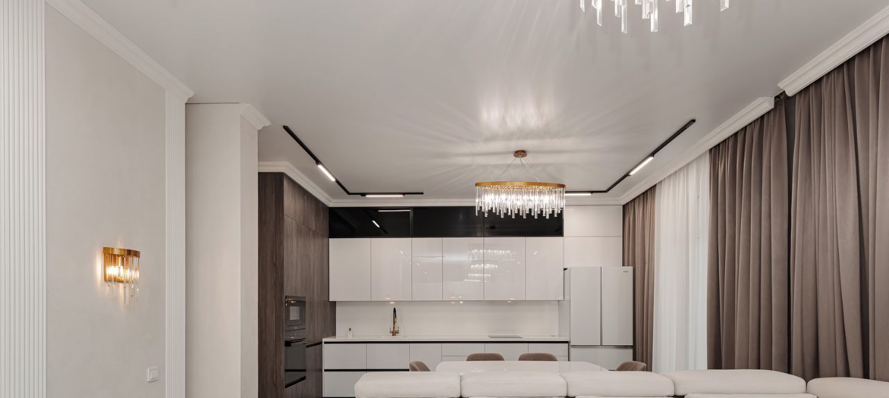 Кухня-гостиная оборудованная большим кухонным гарнитуром и всей бытовой техникой.